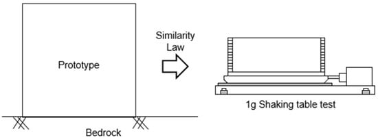 A typical method researchers employ to simulate and analyze the dynamic behavior and response of a prototype is by performing the 1 g shaking table test as shown in Figure 1. A 1 g shaking table test can fully simulate the seismic process. It is the most direct method to study the seismic response and failure mechanism of sites in the laboratory. Most of the 1 g shaking table tests utilize prototypes and adhere to the principles of similarity, ensuring an accurate representation of real-scale ground. On the one hand, some research has focused on experimental analysis, utilizing the 1 g shaking table as the primary method for investigating and analyzing the experimental results. Kim et al. [] aimed to evaluate the influence of soil box boundary conditions on soil dynamic behavior by comparing a rigid box (RB) and a laminar shear box (LSB) through 1 g shaking table tests. Saha et al. [] investigated the effect of soil-structure interaction using a rigid box with permeable boundaries. Niu et al. [] performed a 1 g shaking table test on a scaled model of the rock slope. Lin and Wang [] conducted a shaking table test on a model slope to investigate the initiation of slope failure. The above studies all used 1 g shaking table tests to show the dynamic behaviors of the prototype, but the shortcomings of the 1 g shaking table tests were not considered, such as geostatic stress and confining stress. On the other hand, certain studies have employed numerical analysis techniques to study the 1 g shaking table models, allowing for a more detailed examination of the behavior and response of the tested systems. Kheradi et al. [] conducted numerical analysis and 1 g shaking table tests to evaluate the effectiveness of partial ground improvement as an earthquake countermeasure for the existing box culvert described earlier. Zarnani et al. [] developed a simplified numerical model using FLAC software to simulate the dynamic response of two reinforced earth walls constructed under 1 G conditions. Pitilakis et al. [] conducted a significant study utilizing initial stress–strain loops to compare centrifuge test results with numerical data. Moghadam and Baziar [] conducted a series of 1 g shaking table tests and performed FLAC 2D numerical simulations to investigate the effects of circular subway tunnels on ground motion amplification patterns. Although these studies increased the size of the model, the similarity law was not fully followed between the models, such as the input motion time.