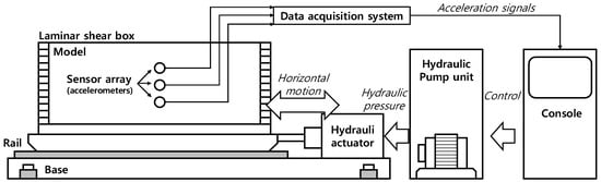 This study utilizes several experimental components to investigate the dynamic behavior of soil. Figure 3 illustrates the schematic diagram of the 1 g shaking table test system, which was the core component for conducting the experiments and obtaining insights into the soil’s dynamic properties. The major equipment includes a 1 g shaking table test system, a laminar shear box, a data logger, and accelerometers.