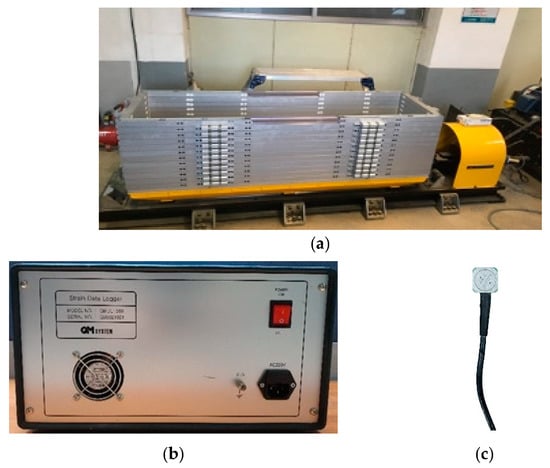 Data logging is the measurement and recording of physical or electrical parameters over a period. Accelerometers are used to capture seismic acceleration. An ARF-20A acceleration transducer was used as the accelerometer for this study, which can be measured up to 20 m/s2. The data logger used the 24-channel SDL-350R model and was compatible with ARF-20A. The data storage interval is up to 0.005 s. Figure 4b,c show the data logger and accelerometer used in this study.