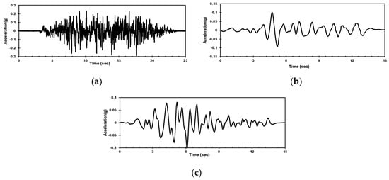 The artificial seismic waves, Hachinohe seismic waves, and Ofunato seismic waves, which correspond to the peak ground acceleration of 0.2 g, were used to determine the fundamental behavior of the ground. The artificial seismic wave is the synthetic seismic wave combining the Gyeongju—Pohang earthquake, using the empirical Green’s function based on the raw data measured at the Kori Nuclear Power Plant. As the artificial seismic wave has different periodic components, high amplification occurs. This is why the artificial seismic wave was selected to evaluate the effects of boundary conditions in the case of high amplification. The Hachinohe wave is a long-period wave and the Ofunato wave is a short-period wave. The seismic waves in this study are shown in Figure 5.