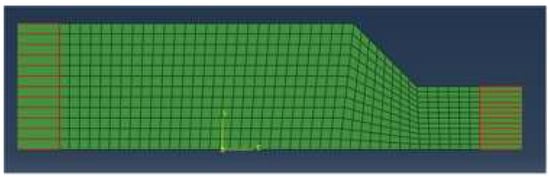 The model was divided into a mesh with dimensions of 0.05 × 0.05 m. The infinite boundary part employs CINPE4 elements. It is a 2D model with only horizontal and vertical boundaries. The bottom boundary only has horizontal acceleration and cannot carry motion in the vertical direction. In order to eliminate the impact of the boundary on model analysis results, the two sides of the boundary were redesigned into infinite boundaries, and the boundary conditions were consistent with the laminar shear box as much as possible, as shown in Figure 8.