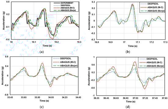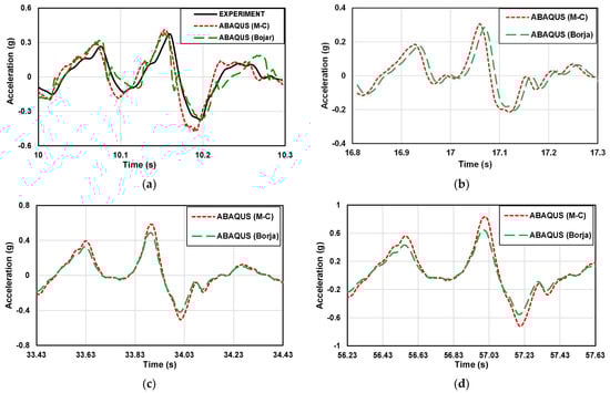 - For different constitutive models, the numerical analysis results were still slightly different. For the flat ground, DEEPSOIL results were closer to the experimental results. For the slope model, the Borja model gave better results than the Mohr–Coulomb model. The input parameters of different constitutive models are different, which is why different numerical analysis results exist.