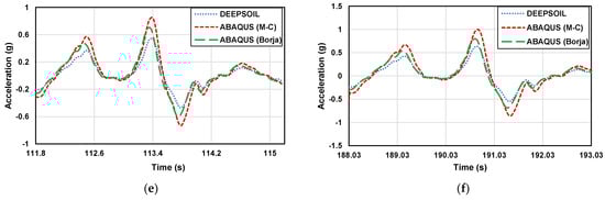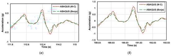 Moreover, the hysteretic curves of the Darendeli model and the Borja model also appear to be unable to follow the Masing criterion because as the strain increases, the damping of the model increases rapidly, and energy is absorbed and attenuated. In the 50-times model, when the strain is more significant than 0.7%, the Darendeli model cannot capture the shear strain well, which can be considered as the Darendeli model reaching the limit of obtaining strain in this study. However, the Mohr–Coulomb model and Borja model can obtain shear strain. It is essential to understand the dynamic behavior of the ground.