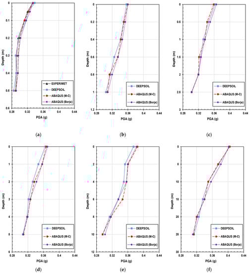 PGA profile for experiment and numerical analysis with the artificial seismic wave. (a) 2 × 0.6 m (1 time); (b) 4 m × 1.2 m (2 times); (c) 10 m × 3 m (5 times); (d) 20 m × 6 m (10 times); (e) 50 × 15 m (25 times); (f) 100 × 30 m (50 times).
