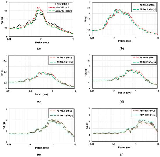 The spectral acceleration of Artificial seismic wave in the flat ground. (a) 2 × 0.6 m (1 time); (b) 4 m × 1.2 m (2 times); (c) 10 m × 3 m (5 times); (d) 20 m × 6 m (10 times); (e) 50 × 15 m (25 times); (f) 100 × 30 m (50 times).