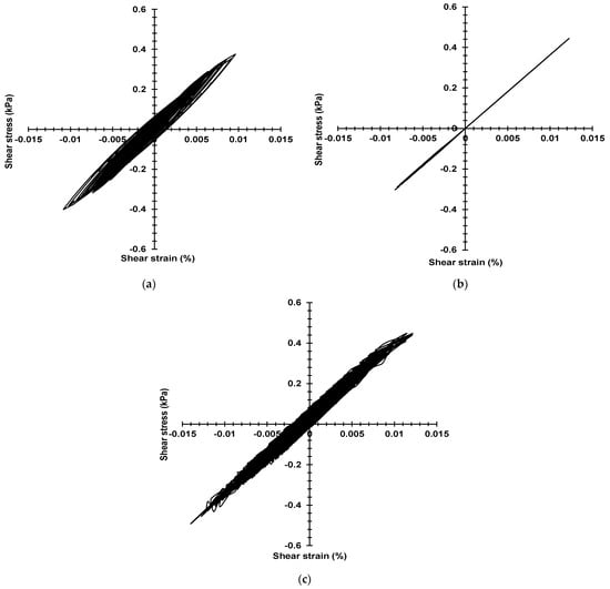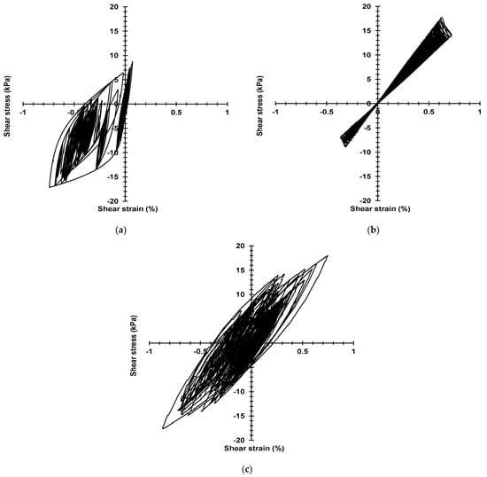 The stress–strain curve of 100 × 30 m (50 times) model: (a) Darendeli model; (b) Mohr–Coulomb model; (c) Bojar model.