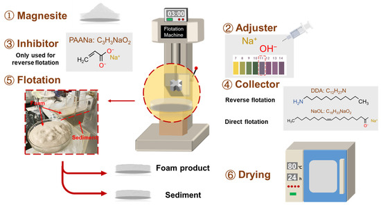 where εi is the recovery of the target element minerals (%), mi and mt are the weight of the target element in the mineral and raw ore (m), respectively, βi is the grade of the target element (%), and ω is the purity of magnesite (%). The flotation process is shown in Figure 3.