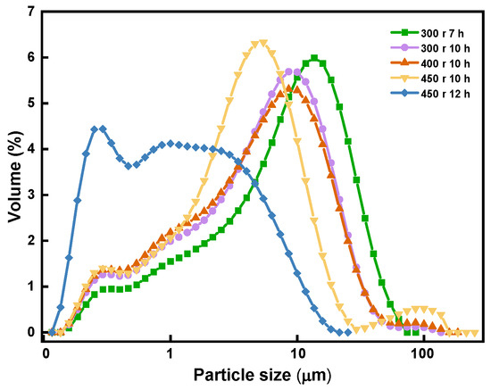 As shown in the figure, the milling duration resulted in a decrease in the size of the magnesite particles. When the magnesite was ground to a degree where high-density sintered magnesia can be obtained through one-step sintering using a ball mill speed of 450 r, the grinding time ought to be limited to approximately 12 h.