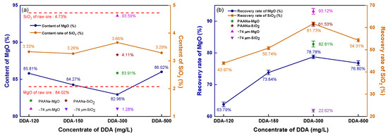 The contents of MgO and SiO2 in the raw ore are represented by red dashed lines in Figure 6a. The flotation concentrate shows a lower SiO2 content than the raw ore (4.73%), ranging from 3.26 to 3.66% as the DDA concentration increases, while the MgO content is higher than that of the raw ore (84.02%) at all levels except for 300 mg/L DDA. Unground magnesite floated at a 300 mg/L DDA concentration yield of concentrate with 93.59% MgO and only 1.28% SiO2. To strengthen the collector effect, an inhibitor, sodium polyacrylate (PAANa), was added at 150 mg/L based on 300 mg/L DDA, which inhibits MgO from entering the foam layer, enhancing the recovery rate of MgO and resulting in an 83.91% MgO content and 4.11% SiO2 content.