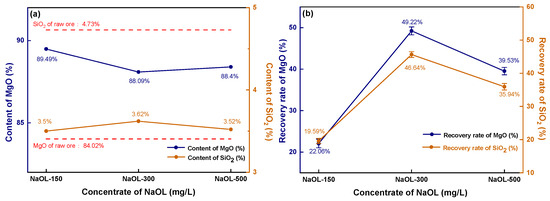 As observed in Figure 7a, the magnesite concentrate obtained through direct flotation has an extremely high MgO content, reaching up to 89.49% when the NaOL concentration is 150 mg/L.