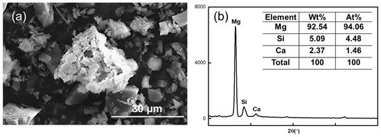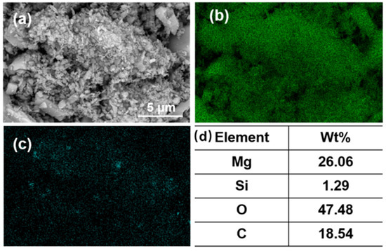 (a) SEM image; (b) EDS mapping for magnesium element, (c) EDS mapping for silicon element, and (d) elemental content of fine particles (<1 μm) in the agglomerates.