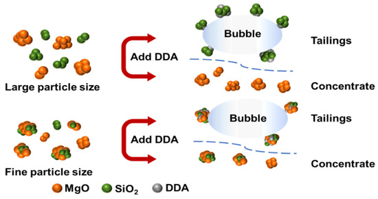 - According to the classical DLVO theory and calculation, the total interaction energy = −8.16 × 10−7 between MgO particles and SiO2 particles was smaller than zero in the cohesive state when the mineral particle size was 2.83 μm. This indicated that agglomeration occurred between the particles. Therefore, interparticle agglomeration of fine particles was the main cause of the low flotation recovery.