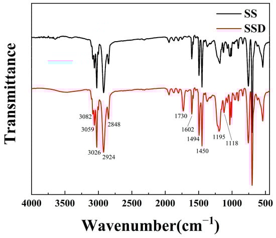 The FTIR spectra of the two polymeric microspheres are shown in Figure 1. The vibrational peaks at 3082 cm−1, 3059 cm−1, and 3026 cm−1 are C-H vibrational peaks at different positions on the benzene ring. The three C-C stretching vibrational absorption peaks in the benzene ring are at 1602 cm−1, 1494 cm−1, and 1450 cm−1. The asymmetric and symmetric stretching vibrational absorption peaks of methylene in the polymer chain are found at 2926 cm−1 and 2833 cm−1. The peaks at 1195 cm−1 and 1118 cm−1 are asymmetric and symmetric stretching vibrational peaks of the sulphonic acid group, indicating that sodium styrenesulfonate was involved in the polymerization. Notably, the peak at 1730 cm−1 is a stretching vibration peak of C=O in the ester group, which indicates that the preparation of SSD contains DMC. In addition, there are no obvious peaks of unreacted vinyl in the spectrum, and both SS and SSD are target products and fully reacted.
