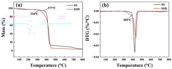 The structures of the two copolymers were further characterised by thermal gravimetric analysis, as shown in Figure 2. Under the same test conditions, the thermal decomposition temperature of SSD is lower than that of SS, but its pyrolysis temperature is still as high, at 316 °C. The cationic side chains of SSD began to undergo thermal-oxidative degradation at 316 °C, followed by a gradual decomposition of polystyrene-based spheres, and the decomposition rate increased sharply after 385 °C. The SS also has two main decomposition processes, one is the rapid decomposition of the microspheres starting at 377 °C and the other is the slow decomposition of the residual main chains and benzenesulphonic acid groups, etc., after the thermal degradation of the SS is basically completed at 430 °C. In summary, both copolymer microspheres have excellent thermal stability.