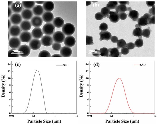 TEM images and particle size of SS (a,c) and SSD (b,d).