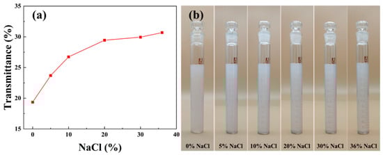 Transmittance of SSD in water with different concentrations of NaCl ((a) Transmittance; (b) appearance).