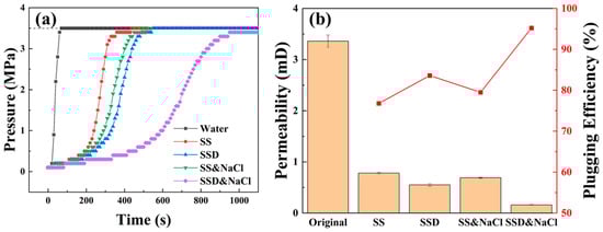 The plugging performance of the microspheres under different dispersion conditions was tested using core pressure transmission and core plugging experiments respectively, as shown in Figure 5. At a differential pressure of 3.5 MPa, the water flows rapidly through the core and balances the pressure at both ends of the core in a remarkably short time. When the microsphere emulsions were added to the water at a concentration of 5%, the pressure equilibration time was significantly extended. SS water dispersion, SS saturated NaCl water dispersion, and SSD water dispersion all had the effect of plugging rock pores and retarding pressure transfer in the core, but all reached pressure equilibrium within 420–550 s. However, with the addition of NaCl, the pressure transfer curve of the SSD aqueous dispersion showed a significant change and its equilibrium time improved more than twice compared to that without NaCl, and the downstream pressure still did not reach 3.5 MPa after 1100 s. The results of the core plugging experiment for 16 h are consistent with the pressure transfer experiment, as shown in Figure 5b. The SSD water dispersion containing NaCl has the optimal plugging effect, with a plugging efficiency of 95.2%. This is mainly due to the fact that, in addition to the SSD microspheres, which can plug the pores of rock by themselves, the electrostatic shielding effect of NaCl disrupts the association of polymer molecules and promotes the dissociation of positive and negative ions from the molecular chains on the surface of the microspheres, allowing the microspheres to adsorb on the rock surface to enhance the adsorption stability. Moreover, NaCl enhances the dispersion of SSD and promotes the gradation of the microspheres, which improves the plugging efficiency.
