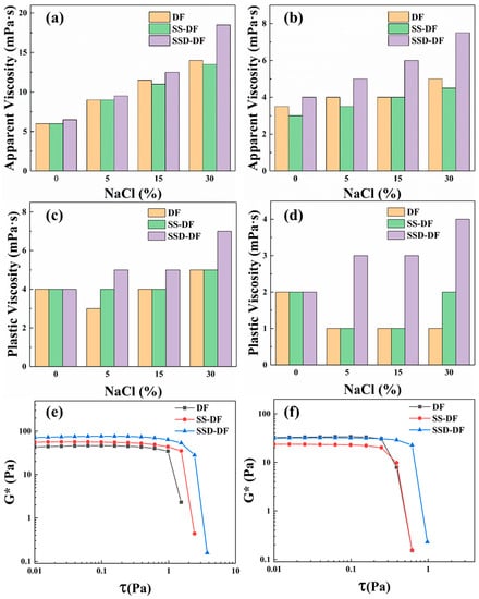 Rheological properties of drilling fluids ((a,c) 25 °C; (b,d) 200 °C; (e) 25 °C & 36% NaCl; (f) 200 °C & 36% NaCl).