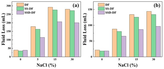 The rheological properties of the drilling fluid are of critical importance. They are related to the rock-carrying properties of the drilling fluid, as shown in Figure 6. At room temperature, the apparent viscosity of DF gradually enhanced with the increase of NaCl content, which was due to the fact that NaCl compressed the diffuse double layers of clay, leading to the agglomeration of clay particles and the increase in apparent viscosity of the DF. The addition of SS failed to change the rheological properties of the drilling fluid, whereas SSD had a more pronounced viscosity-increasing effect with increasing concentration of NaCl. The high-temperature and NaCl weakened the intergranular interactions of the clay, resulting in low apparent and plastic viscosities of the clay. Even after hot rolling at 200 °C, SSD still showed a significant viscosity-increasing effect with increasing NaCl, while the added SS had no effect. This is due to the facts that NaCl brings a large number of charges to the drilling fluid, weakening the electrostatic force between positive and negative charges on the molecular chain on the surface of SSD, and the molecular chain is altered from curling to stretching, thus, improving the viscosity of the drilling fluid. In contrast, SS is an anionic monomer-modified styrene microsphere, which does not exhibit this phenomenon and ability.