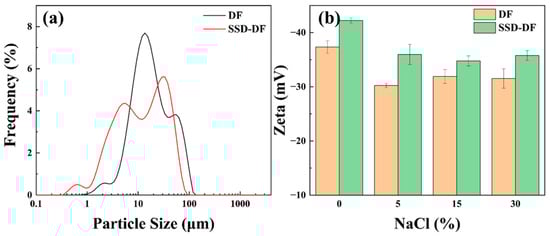 The mechanisms of SSD in drilling fluid was further investigated using particle size analysis and zeta potential analysis. As shown in Figure 10a, the DF particle size distribution curve shifted to the left after adding SSD, indicating that the dispersion of drilling fluid particles increased and the particle size decreased. This facilitates the formation of a denser mud cake and reduces the fluid loss of the drilling fluid. Zeta potential can reflect the stability of the system; larger absolute values of Zeta indicates a more stable the system. Poor stability of drilling fluids will lead to degradation of drilling fluids performance, solids settling, and bits burial, which is critical to drilling safety. As shown in Figure 10b, the absolute value of Zeta decreases dramatically after adding NaCl to the DF. With the increasing concentration of NaCl, the zeta values of the drilling fluids were all close to the critical value for system stability (−30 mV), and the stability of the DF was greatly reduced. Furthermore, SSD can effectively increase the absolute zeta value of DF at all NaCl concentrations, indicating that its addition enhances the stability of drilling fluid and improves the comprehensive performance of drilling fluid.