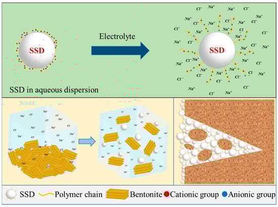 The mechanism of SSD in drilling fluids was revealed through a series of experiments, as shown in Figure 11. SSD is an amphoteric ion-modified styrene-based micro-sphere, in which the surface polymers are curled due to the polyelectrolyte effect. When SSD is in the aqueous dispersion system, it exhibits salt-responsive properties with the added electrolytes, such as NaCl, and the polymer chains on its surface gradually stretch, leading to an increase in the visible light transmittance of the aqueous dispersion of SSD. Therefore, when SSD is added to the drilling fluid, it can improve the dispersion of clay under salty conditions and improve the stability of the drilling fluid, which in turn reduces the fluid loss of the drilling fluid and enhances its rheological properties. After SSD enters the formation with the drilling fluid, it can also be the first to enter and plug the microporosity and microcracks under the effect of differential pressure, preventing the drilling fluid from intruding into the formation, and maintaining the stability of the wellbore and drilling safety.