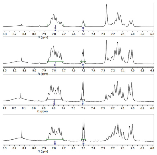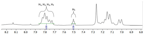 The close-up of the integrated 1H-NMR spectra can be seen in Figure 11 and Figure 12. The DS was determined by setting the integral of the H1, H2, H3 and H4 protons to four (shown in Figure 11), as their peak intensities are not affected by DS, and the peak integral of the H5 proton directly corresponds to the DS of the SPEEK membrane (Table 3) [40].
