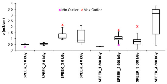 Figure 3 presents a box plot of the calculated proton conductivity measurements for both unirradiated and irradiated SPEEK membranes. The box plot is constructed from five values: the minimum value, the 25% quartile, 50% (median), the 75% quartile, and the maximum value for each type of membrane characterized by impedance analysis. It can be seen from Figure 3 that conductivity of the non-irradiated membranes changes proportionally to the increase in the DS. An increase in acidic groups promotes hydrophilic interactions, resulting in increased water absorption due to hydrogen bond formation. The absorbed water forms even more pathways for protons. By increasing the number of sulfonate groups in the polymer and, by extension, the membrane, hydrophilicity is increased, increasing water absorption and facilitating proton transport [16,36,37]. In the case of the electron-beam-irradiated SPEEK membranes, a tendency for increased conductivity is presented, with the SPEEK membrane of DS 90% showing the highest proton transport capability. The increase in the proton conductivity appears to be much steeper and quicker for irradiated membranes than their non-irradiated counterparts, indicating a change in structure that facilitates the transport of protons.