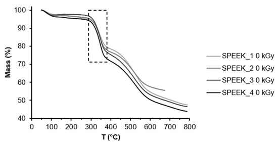 The TGA curves of non-irradiated and irradiated SPEEK membranes are expressed in Figure 4 and Figure 5 and show three thermal transition stages for all membranes. The first mass loss can be attributed to water evaporation, the second one to the desulfonation reaction: 4SO3H → 4SO2 + 2H2O + O2 and the last one can be attributed to oxidative pyrolysis of the PEEK chain, forming H2O and CO2 upon decomposition [38]. It is likely that due to varied distribution of the sulfonic acid groups in the polymer, they decompose at slightly different temperatures. According to the TGA data, the DS slightly increased after irradiation (Figure 5). This might be related to the radiation-induced sulfonation from the unreacted acid in the membrane structure.
