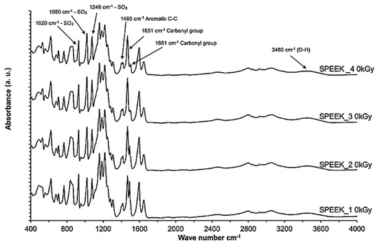 It was observed that the DS values after irradiation in most cases were elevated by 8%, showing that electron beam radiation influences the structure of the membrane. However, for absorbed doses up to 500 kGy, SPEEK remains stable and is suitable for beta negative radiation environments. The biggest change was observed in SPEEK_4 with DS 90%, while the smallest was in SPEEK_1 with DS 60%, indicating that after irradiation, the higher the DS, the larger the change in the membrane’s structure, possibly due to higher sulfonic acid group counts providing more opportunities for irradiation-induced polymer structure change.