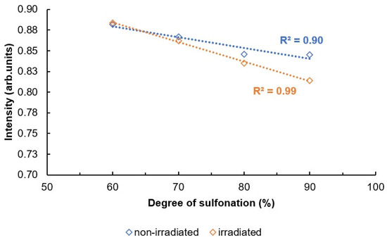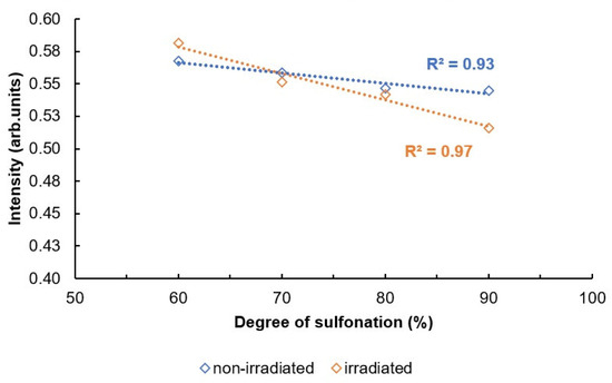 The bond vibrations observed at 1185 cm−1 in the FT-IR spectrum correspond to asymmetric and symmetrical O = S = O stretching vibrations. The sharp absorption peak at 1596 cm−1 is attributed to the aromatic C = C vibration [39]. It is shown in Figure 9 and Figure 10 that these two characteristic peaks show a linear decrease in absorption intensity when the degree of sulfonation is increased, with the R2 of the non-irradiated values for 1185 and 1596 cm−1 peaks being 0.90 and 0.93, and for irradiated values, 0.99 and 0.97, respectively.