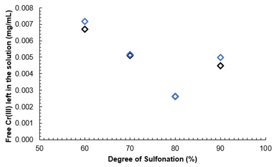It can be seen that a higher DS correlates with a lower leftover Cr(III) mass concentration compared to the original solution due to the reaction of Cr(III) ions with -SO3H groups. The pKa of SPEEK is reported as 1.58 for SPEEK with DS 85% in [41], meaning that above pH 1.58 SPEEK -SO3H groups will have already displaced the protons creating an ionic bond between the -SO3− group and Cr(III) atoms. The obtained pH values for SPEEK samples with DS 60%, 70%, 80% and 90% were as follows: 2.63, 2.84, 1.94, 2.32. As Cr(III) ions carry a 3+ charge, three sulfonic acid groups are expected to be attached to one Cr atom.