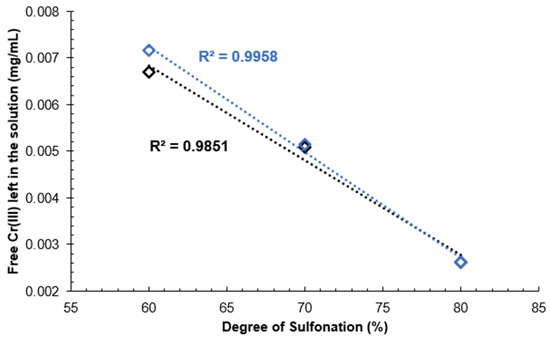 One explanation for the deviation from the linear correlation with DS 90% could be that the polymer starts dissolving in the aqueous medium, inhibiting the reaction with Cr(III) ions.