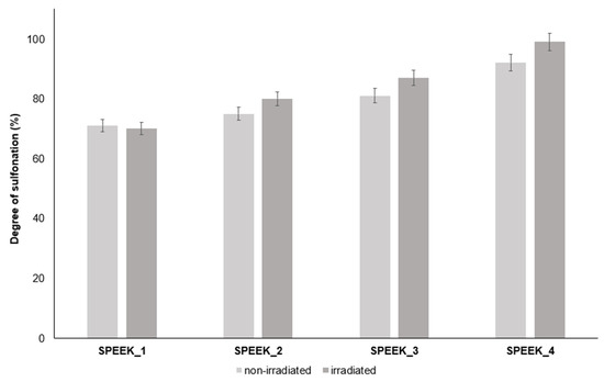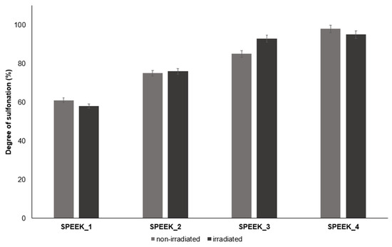 Due to its good radiation stability, SPEEK can also be used in radiation environments, such as nuclear facilities, space applications and proton exchange membrane-based enrichment of the hydrogen radioactive isotope, tritium [25,26]. Insufficient research has been performed to determine the effects of ionizing radiation on the DS, as well as how electron beam radiation affects the structure of the membrane, which affects the determination of DS.