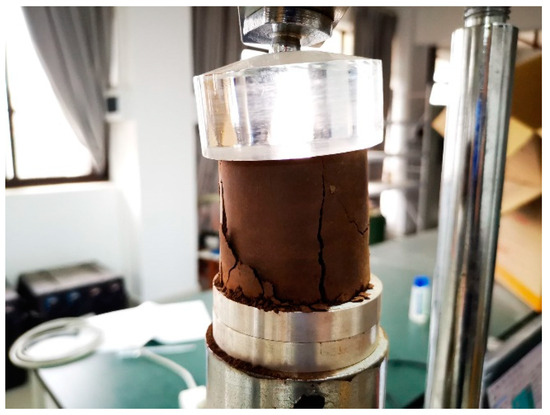The unconfined compression test was carried out by a TSZ series fully automatic triaxial instrument produced by Nanjing Soil Instrument Factory Co. (Nanjing, China). The instrument can directly obtain the experimental maximum compressive strength and the relationship curve between the main stress difference and axial strain. The experimental parameters were set as follows: specimen height, 5 cm; specimen diameter, 5 cm; rigid steel ring coefficient, 30 N/mm; axial strain, 15%; loading level, 1 level; sampling step, 0.125 mm; shear rate, 2.5 mm/min.