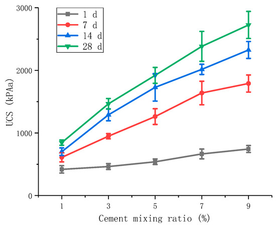 Figure 5 shows that the unconfined compressive strength of the red mud-based stabilized soil modified by nano-SiO2 co-cement showed a linear increase with the increase in cement admixture. For example, the unconfined compressive strength at 7 d was 865, 1434, 1892, 2273, and 2547 kPa for 1%, 3%, 5%, 7%, and 9% of cement admixture, respectively. For each 2% increase in cement, the increases were 569, 458, 381, and 274 kPa, respectively.