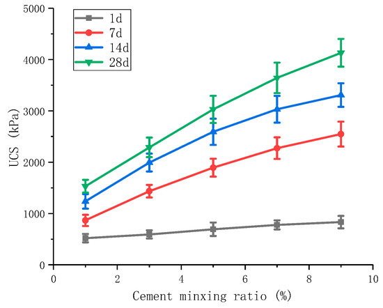 When the cement was modified alone, the specimens were dosed with 1%, 3%, 5%, 7%, and 9% of cement. The test results are shown in Figure 4.