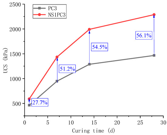 Figure 6 shows the comparison of unconfined compressive strength with curing time for the addition of 1% nano-SiO2 with and without the addition of nano-SiO2, provided that the cement admixture is 3%. The NS1PC3 combination of nano-SiO2 synergistically modified with cement showed a large increase in unconfined compressive strength with curing time. For the same curing age, the unconfined compressive strength of the NS1PC3 synergistically modified combination increased by 27.7%, 51.2%, 54.5%, and 56.1%, respectively, compared to the PC3 alone modified combination. In addition to this, there is a characteristic that the growth of the lateral limit compressive strength tends to increase from 1 to 7 d, and the subsequent growth is more moderate, indicating that the growth rate of the lateral limit compressive strength is mainly concentrated from 1 to 7 d. This indicates that the synergistic effect of nano-SiO2 and cement improves the early unconfined compressive strength of the red mud-based stabilized soil.