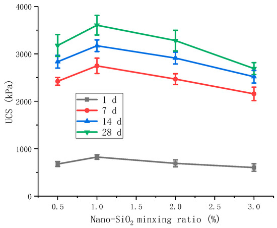Under the premise of 3% of cement and 6% of gypsum, nano-SiO2 was selected at 0.5%, 1%, 2%, and 3% to test the increase in unconfined compressive strength of red mud-based stabilized soil under the action of nano-SiO2 in cooperation with cement and gypsum. The test results are shown in Figure 7.