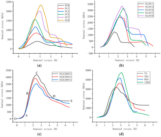 Nominal stress–strain relationship curve of modified red mud-based stabilized soil. (a) Nominal stress–strain curve of cement-modified specimens at 28 d age. (b) Nominal stress–strain curves of specimens modified with SiO2 and cement at 28 d. (c) Nominal stress–strain curves of specimens modified with nano-SiO2, gypsum, and cement at the age of 28 d. (d) Nominal stress–strain curve of NS1CS6PC3 modified combination with curing time.