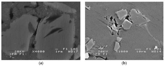 SEM micrographs of the defects of a SiC/silumin composite reinforcement (own research): (a) brittle breaks of particles, and (b) chipping of reinforcement elements.