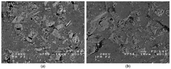 SEM micrographs of defects in a SiC/silumin composite (own research): (a) clearly visible slight blisters in the composite structure between the matrix and the reinforcement particles, and (b) discontinuities of the matrix structure.