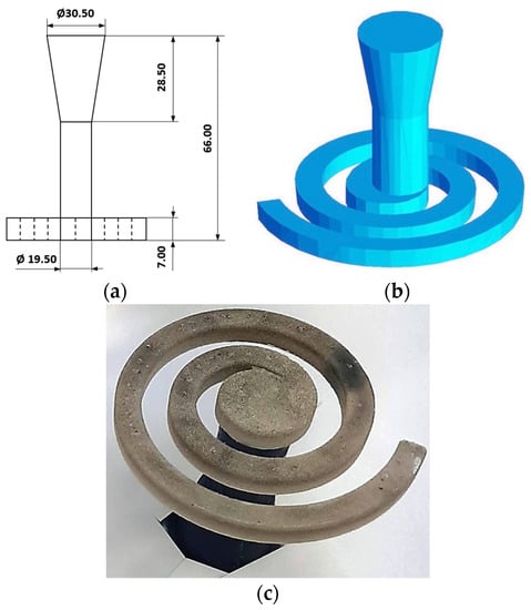 Ceramic spiral: (a) Technical drawing of the 2D model, (b) 3D model system, and (c) view of a paraffin-impregnated ceramic spiral with a wax gating system.