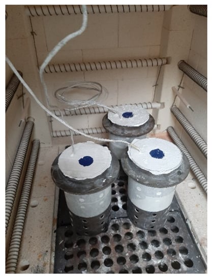 Thermoelements were connected to the model systems in selected places and located in perforated stainless steel sleeves with the following dimensions: diameter—100 mm; height—200 mm. The sleeves were filled with plastic gypsum mass by Ransom & Randolps, which was prepared from water and gypsum powder in a proportion of 1:2.5, where, after mechanical mixing of components, the mass was degassed in a vacuum chamber [44]. After being tied and dried, the molds prepared in this way were placed in the furnace (Figure 6), where, in the first cycle, the gating system was melted, and, in the next cycle, the molds were annealed in an incremental cycle until the temperature was 720 °C. During this time, the paraffin in the capillaries of the reinforcement was completely gasified, and the mold was completely hardened. The furnace temperature was then lowered to 600 °C where the molds awaited pouring.