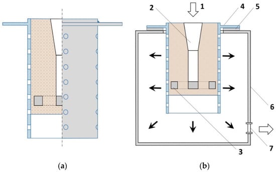 Mold diagram: (a) the process of pouring the mold, (b) 1—resultant pressure acting on the metal column, 2—main filler, 3—preform, 4—mold ring, 5—gasket, 6—vacuum chamber, 7—suction pipe valve, and arrows—pressure direction.