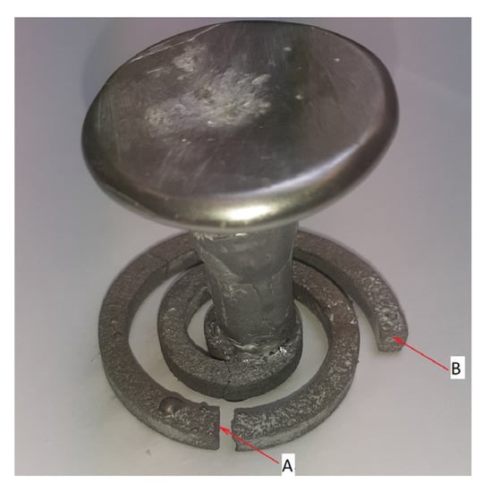 The casting after being knocked out of the mold and cleaned with the sample collection areas marked to assess the degree of filling—exemplary locations for obtaining samples: ½ of spiral length (A); casting boundary area (B).