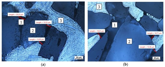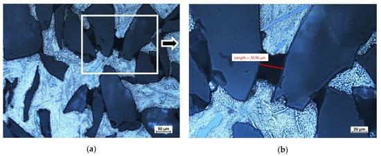 Optical light microscopic images. Evidence for anomalies in the imaging technique using optical microscopy. The unfilled area of Al2O3 reinforcement with AlSi11 matrix metal of sample no. 3 (designation in accordance with Table 3) at different magnifications: marked area of unfilled capillary measurement (a); the value of the unfilled capillary measurement (b).