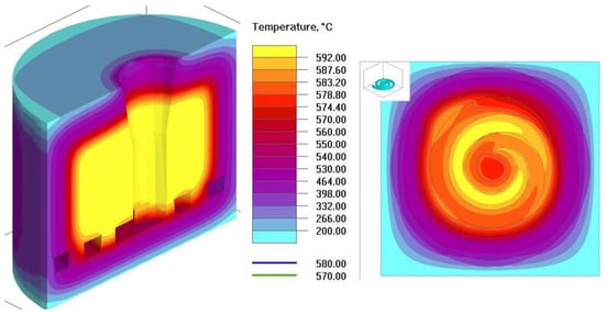 The substitute thermophysical parameters of reinforcement were assumed as constant values in the temperature range of 450–600 °C: heat conductivity 1.6 [W/(m·K)] and volumetric heat capacity 0.34 × 106 [J/(m3·K)]. The initial temperature of the alloy was 589 °C, and the filling process was started at 425 s of the simulation. The temperature distribution in the mold was simulated for different times after removing the mold from the furnace (initial temperature of the mold and reinforcement—600 °C). As a result of the process of transferring heat by the mold to the environment, the temperature of the mold decreased. Due to the fact that the saturation process started 425 s after removing the mold from the furnace, the temperature in the external parts of the mold dropped below 200 °C. As a result of the simulations, information about the temperature distribution in the mold at the end of the saturation process was obtained. Based on the data from the experiment, the place where the saturation process ended was identified (for casting no. 8 it is 154 mm of the spiral length) and the temperature of the reinforcement and liquid alloy was read in the simulation program at this point. The values of these identified temperatures were used to carry out the energy balance. The exemplary temperature distribution in the mold on the horizontal cross-section of the mold for casting no. 8 from Table 3 is presented in Figure 12.