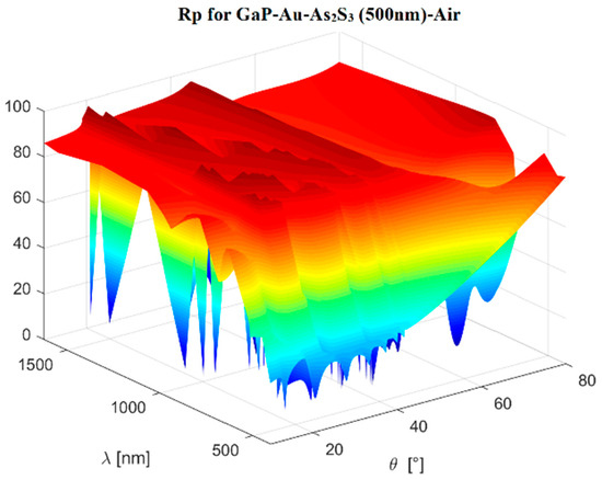 Below, we describe the calculations and analysis of the results obtained based on the method presented above. The influence of various parameters of materials on the characteristics of the SPR structure was analyzed. Simulation considered the thickness variation of metal and dielectric layers in a four-layer structure: gallium phosphide (material of the coupling prism)–Au (metal layer)–As2S3 (dielectric layer)–air. We considered three thicknesses of the Au film (i.e., 40, 45, or 50 nm) and four thicknesses of 300, 500, 700, and 1000 nm for As2S3. The refractive index of GaP (n = 3.1) is higher than the As2S3 refractive index (n = 2.45). Figure 3 presents 3D mappings for p-polarized reflectance Rp. The calculations are carried out for usual laser sources such as laser diodes or DPSS lasers and for incidence angles θ ranging between 10° and 80°.