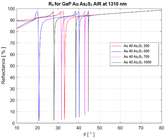 Reflectance as a function of incidence angle for s polarizations at the wavelength of 1310 nm. The SPR structure has an Au film (40 nm thickness) and an As2S3 film with different thicknesses in nm. For a thickness of 300 nm, only one resonance at 33° occurs. For larger thicknesses, two sharp resonances can be observed, meaning that higher sensor sensitivities can be obtained.
