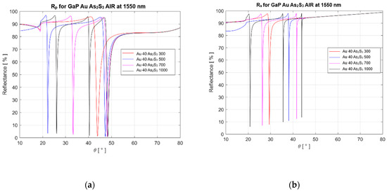 The reflectances Rp and Rs as a function of incidence angle for two polarizations (p and s) at a wavelength of 1550 nm: (a) for the SPR structure with Au film (40 nm thickness) and As2S3 films with different thicknesses in nm; (b) for the SPR structure with Au film (40 nm thickness) and As2S3 films with different thicknesses in nm. For the same film thickness, the values of the resonance angles corresponding to figure (b) are lower for s polarization. The reflections for the resonance angle are closer to zero for p polarization, while for s polarization they are not. At large thicknesses (700 nm and 1000 nm), two resonance angles corresponding to different waveguide modes can be observed.